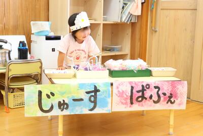 保護者の方や友だちとのやりとりを楽しむ子どもたちの笑顔がたくさん見られたお店屋さんごっこでした。