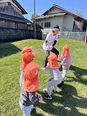 絶好のお天気の中、つばめ組・はと組さんは帰帆島へ木の実拾いへ。