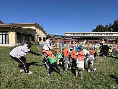 お芋掘りを楽しんだ後はツルで綱引きをしたり、リース作りをしました。