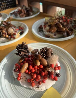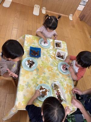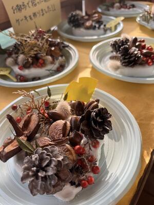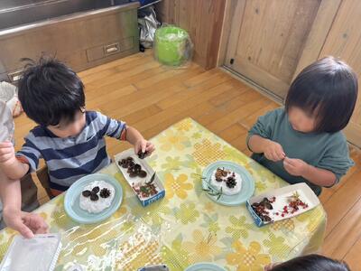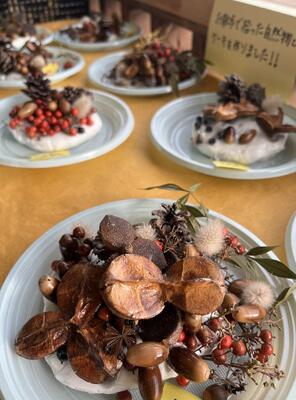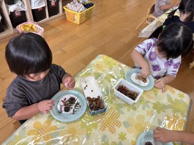 秋の実ケーキ 投稿: 正休 (11/21) ひよこ組さんがお散歩に行って拾って集めた秋の実や葉っぱで、秋の実ケーキを作りました。 好きな実や葉っぱを選んで、粘土に飾っていきましたよ。 色んな秋の実が沢山乗った素敵なケーキが出来上がりました! 靴箱の上に飾ってあるので、覗いてみてくださいね。