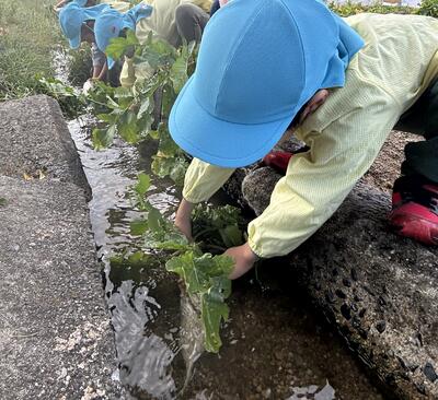 川で洗ってから、給食室に持っていきました。
