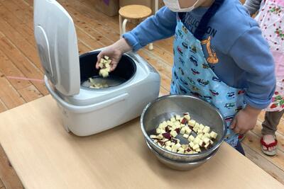 お部屋で劇の練習をしている時、炊飯器の近くで出番を待つ子ども達が「良い匂いがしてきた〜」と気付き大喜びしていましたよ。