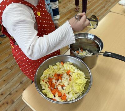 別のお鍋にみんなが切った野菜を入れていきます。