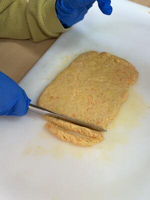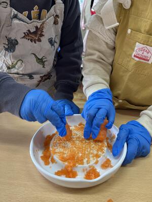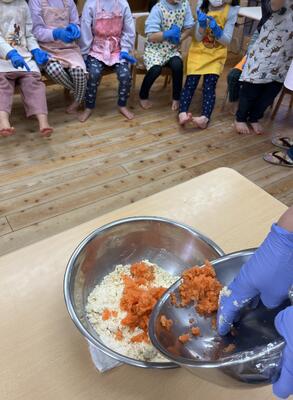 みんながすりおろした人参と小麦粉、油、粉チーズを混ぜて生地をこねていきます。