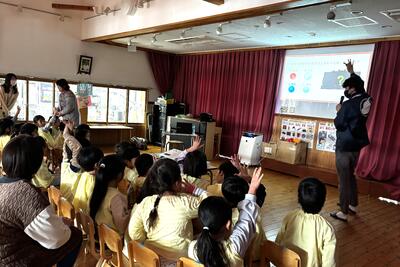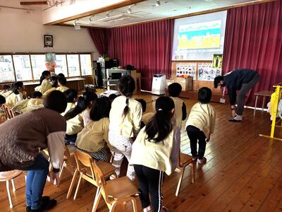 国際文化理解教室 投稿: 正休 (15:38) 今日は国際文化理解教室があり、つばめ組とはと組さんが、アメリカから来られたガビン先生と一緒にクイズや歌あそびをしました。 日本とアメリカの国の大きさを比べたり、色や動物の英語を教えてもらいました。 子どもたちは聞こえた英語をそのまま真似ながら上手に発音して楽しんでいましたよ。