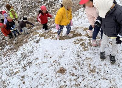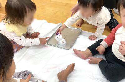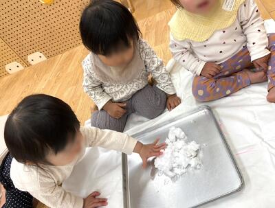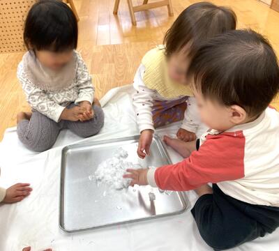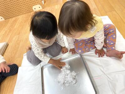 雪遊び 投稿: 正休 (01/26) 今朝はうっすら積もった雪に大喜びの子どもたち。 小さな小さな雪の玉を持って追いかけたり追いかけられたりして雪合戦を楽しんだり、真っ白の道に足跡をつけて遊んだり、とても嬉しそうにしていました。 たまご組さんもお部屋で雪の感触を楽しみましたよ。