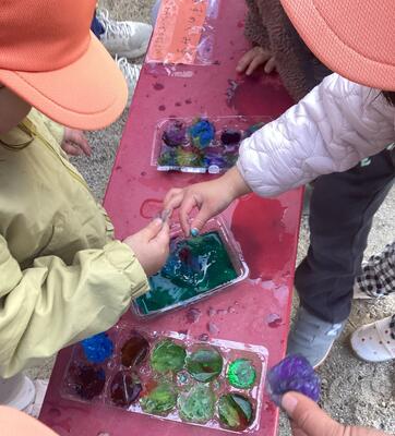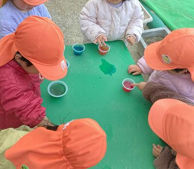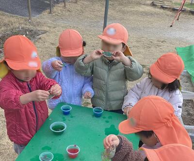 すずめ組さんの氷づくり 投稿: 正休 (16:00) 強い寒波で今日も朝から寒い1日でした。 すずめ組さんは、おはながみを入れた氷をつくりました。 ツンツンと表面を優しく触って確かめると・・・「かたまってるー」「できてるよ!」「やったー!」と大喜びです。 できた氷を手に取って「つめたーい!」「きれいだねー」と冷たさや固さを感じながら、光に透ける氷を楽しむ子どもたちでした。
