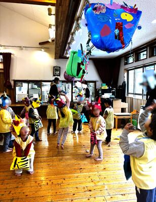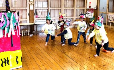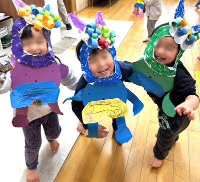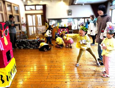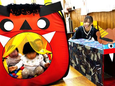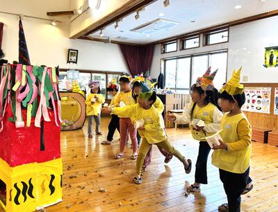 子どもたちがカラフルなかわいい鬼になって紙で作った豆をまきました。